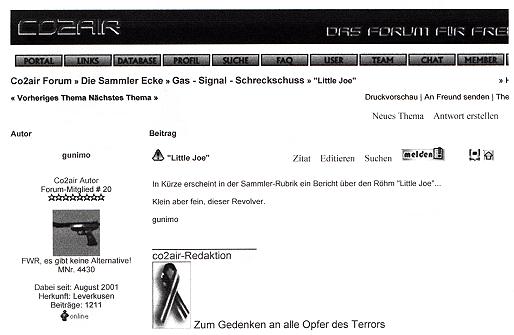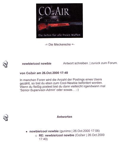Am 10. Oktober 2000 dann, registrierte ich mich mit meinem Nick „gunimo“ im „Co2air“-Board, nachdem ich mich unter meinem Klar-Vornamen bereits in der „Meckerecke“ geäußert, und am 7.10.2000 im „Marktplatz“ ein paar Suchanzeigen geschaltet hatte. „Harry“ postete damals meist unter dem Pseudonym „Co2air-Boardbetreiber“ mit der Signatur „Co2air – die Reaktion“. Anon trat nur sehr selten in Erscheinung und „Timebird“ werkelte praktisch im Hintergrund. Nachdem der Anfang gemacht war, wurde ich umgehend zum Stammuser, der täglich das Forum aufsuchte. Ich beteiligte mich fleißig an den Vorschlägen zur „WoM“, was mir leicht fiel, da ich ja über eine Vielzahl von Exponaten verfügte.