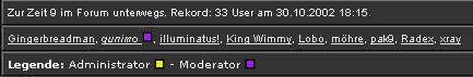Bemerkenswertes in Zahlen: 10.09.2001 100 User sind registriert 01.11.2001 180 User sind registriert 31.12.2001 300 User sind registriert 07.01.2002 Harry vermeldet den Rekord von 1.600 Usern die das Board an diesem Tag besuchten (aus ca. 30 verschiedenen Ländern) 25.01.2002 400 User sind registriert Am 10.02.2002 begrüßt das Redaktionsteam einen prominenten Neuzugang, den „Ein-Admin“ und Redakteur von Visier-Online. „Hallo Uli“ ;-) 27.04.2002 700 User sind registriert 29.01.2003 1.500 User sind registriert 05.08.2003 2.362 registrierte User, 3 Admins, 10 Mods, 18 Members Im August 2003 weist das Forum mehr als 100.000 Beiträge aus! (durchschnl. ca. 80 Beiträge /Tag) Der Thread mit dem Titel „Registrierungen“ enthält 50 Seiten, 998 Postings, 11.926 Hits stehen zu Buche. Ein echter Dauerbrenner, von „gunimo“ am 3.9.2001 als ‚Begrüßungsthread’ eröffnet. Anlass war beim Stand von 93 registrierten Usern die Ankündigung der 100er-„Schallmauer“.