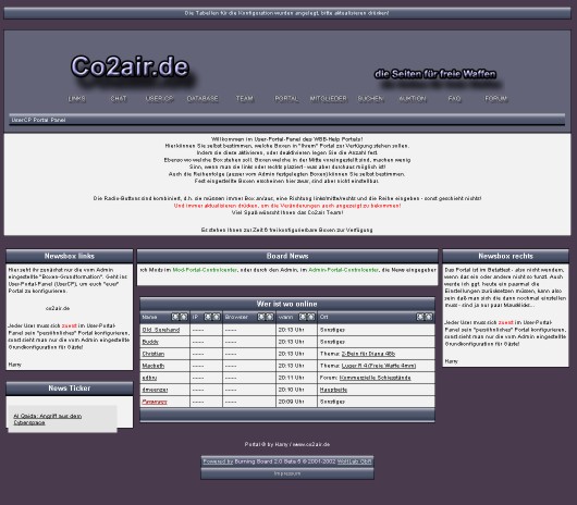 Am 6. Sept. 2001 verabschiedet der Besitzer des „FUNGUN“-Servers (König) das „Co2air“-Board von seinem Server. Begründung: „Zu viel Traffic“! „Harry“ ‚findet’ aber umgehend eine neue „Heimat“. 10. Sept. 2001: Das „Gästebuch“ wird ‚ausgelegt’.