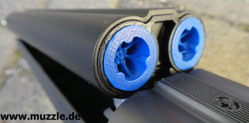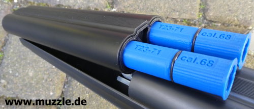 Die Hülsen werden wie echte Schrotpatronen in den Lauf geladen. Dabei muss die abgeflachte und beschriftete Seite der Shot Shells nach oben weisen (Bilder unten).
