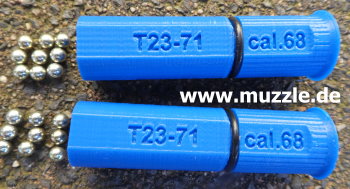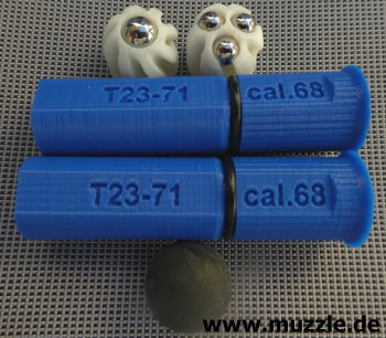 Die “T4E HDS 68” wird vom Hersteller zwar als “Home Defense”-Waffe beworben, allerdings ist das meines Erachtens unsinnig, denn von einer CO2-Waffe die eine Mündungsenergie von lediglich < 7,5 Joule entwickelt, kann man definitiv nicht erwarten einen Angreifer effektiv abwehren zu können. Heim-/Selbstverteidigung also praktisch nicht möglich. Warum ist das so? Die 7,5 Joule-Grenze mit deutscher Kennzeichnung “F” im Pentagon: Nach Erkenntnissen des Pathologen Prof. Karl Sellier, der sich wissenschaftlich mit Wundballistik, Schusswaffen und Schusswirkung, sowie Schussentfernungsbestimmung beschäftigt hat und zu diesem Thema etliche Publikationen veröffentlichte, liegt die Grenze für ernsthafte/folgenschwere Schussverletzungen durch Projektile oberhalb der 7,5 Joule-Grenze. Daran hat man sich beim Waffengesetz (seit 1972) für “Freie Waffen” orientiert. Ergo: Eine Waffe zur Selbstverteidigung haben wir hier nicht, wohl aber eine tolle Fun-/Aktionwaffe für das Plinking auf dem Heimschießstand. Und dafür gibt es jetzt ein interessantes Ladetool aus Kunststoff in Form einer Schrotpatrone. Bezeichnung: “T23-71”. Wie schon der “Slugmaker.688”, stammt auch dieses innovative Zubehörteil aus der Ideenschmiede von Stefan Weber. Homepage www.tech23.de . Das Produkt aus dem 3D-Drucker zum Verschießen von jeweils 9 Stück BBs im Kaliber 6 mm kommt im Doppelpack zum Kunden.