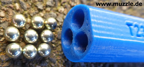 In den Fotos unten sind Stahlkugeln im Kaliber 4,5 mm zu sehen. Diese können zwar auch verschossen werden, rollen aber wegen ihrer Untermaßigkeit vorne aus den 6mm-Lagern wieder heraus. Daher ist es bei der Verwendung von Kugeln dieses oder noch kleineren Kalibers notwendig, die drei Öffnungen z. B. mit einem Watte-, Stoff- oder Korkpropfen zu verschließen. Außerdem nachteilig: Die “HopUp”-Funktion greift hier nicht.