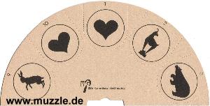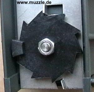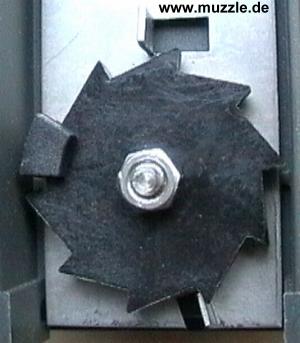 Dies ließ sich nur dadurch verhindern, dass eine flachere Mutter zur Verwendung kam, und diese mit einer zweiten gekontert wurde. Danach funktionierte der Rotoschusskasten tadellos.   Die Zehnerscheibe ist mit verschiedenen Motiven erhältlich (Bilder unten):