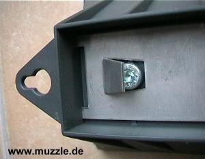 kurzzeitig herausgedrückt, die dann ihrerseits die Metallplatte auf der Rückseite des Kastens nach oben schiebt, weil die Schraube die schräggestellte Ausfräsung berührt.