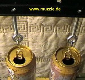 Die an Schnüren aufgehängten CO2-Kartuschen (Fotos unten) geraten bei einem Treffer kurzzeitig ins