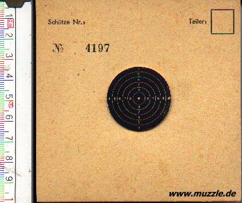Bild unten: “Internationale LG-Scheibe” 10 m, Karten-Maße: B=12 cm, H = 14 cm, Scheiben Durchm. 8,2 cm,
