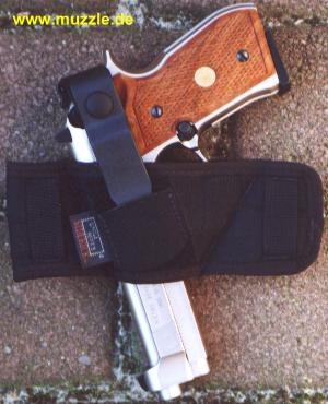 kann. Der Sicherungsriemen ist mit einem starken Klettverschluss befestigt, sodass das Holster an die gängigen Waffenmodelle angepasst werden kann. Es ist somit für Pistolen und Revolver gleichermaßen geeignet. Der
